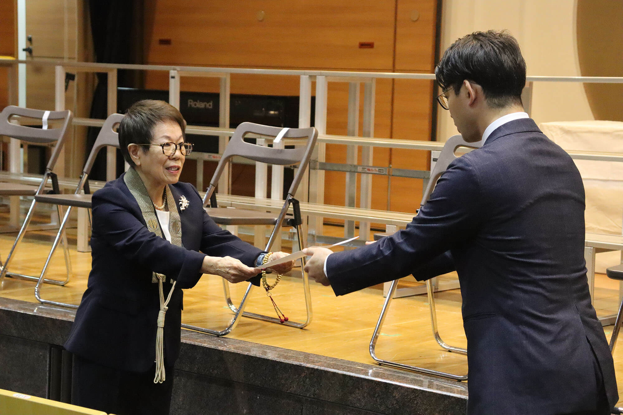 式典では、長谷川理事長より新任教職員へ向けた歓迎の言葉が送られました。その中で、本学園のルーツや建学の精神に触れ、同じ志を持つ「共同体」として共に歩んでいくことの大切さが説かれました。